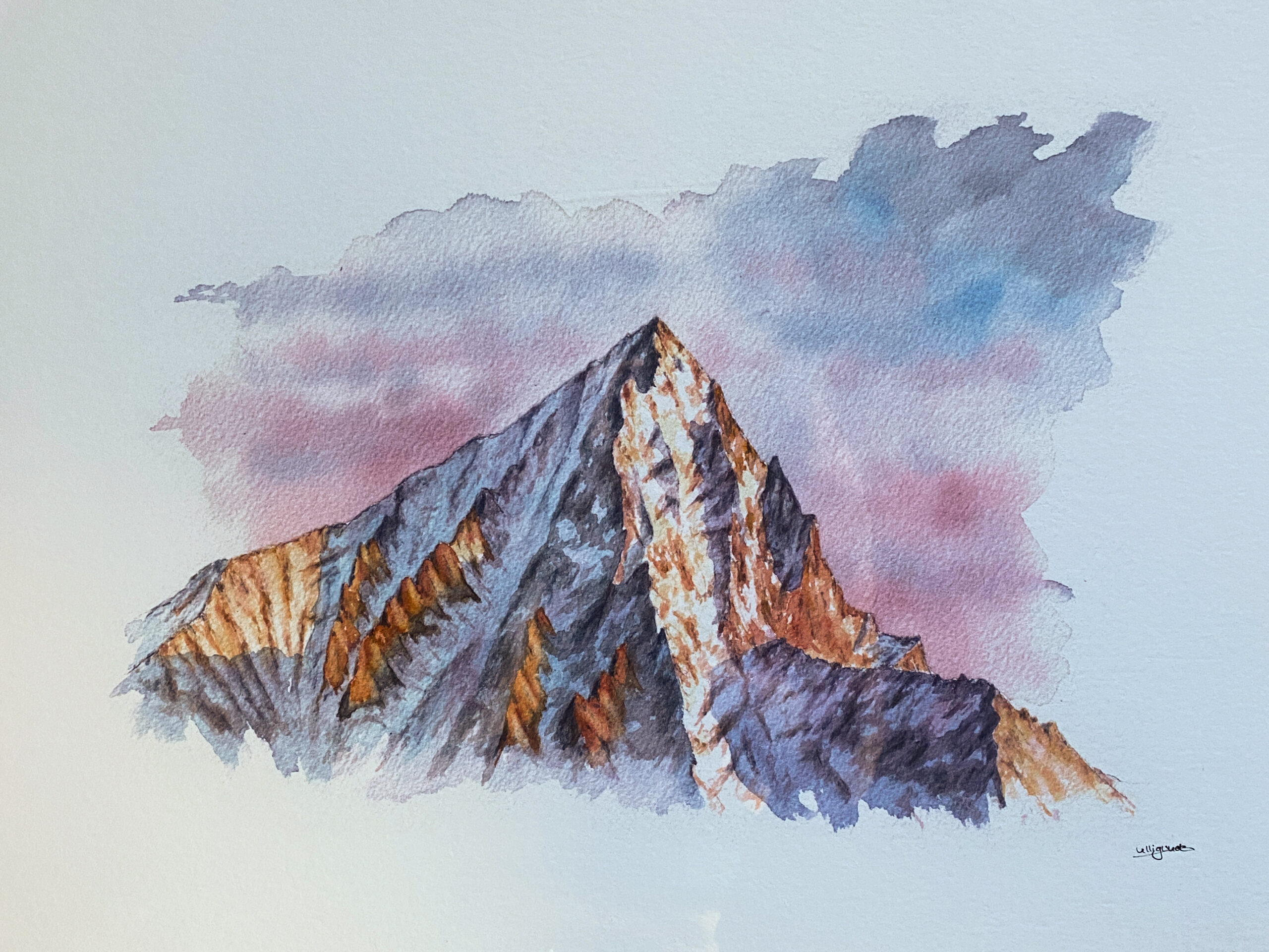 Es handelt sich um einen Nachdruck meines Aquarells „Bietschhorn“ auf hochwertigem Kunstpapier in Museumsqualität und in bruchsicherem Acrylglas gerahmt.